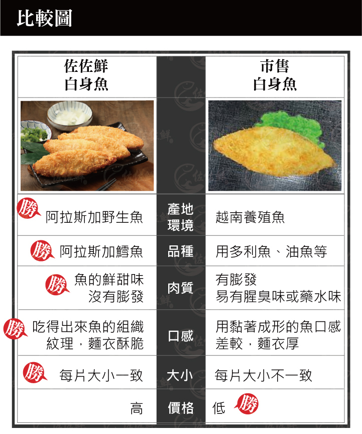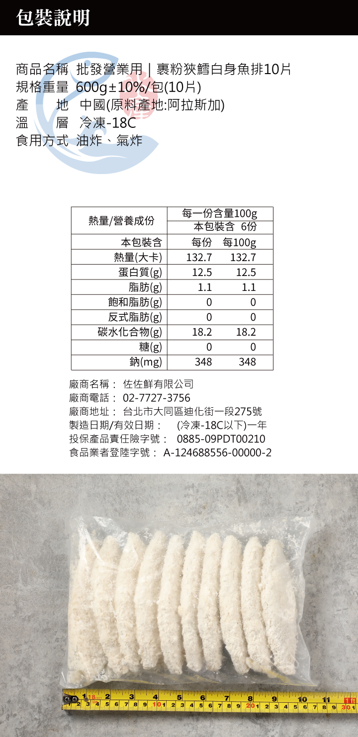 佐佐鮮裹粉狹鱈白身魚排,嚴選阿拉斯加狹鱈鱈魚,肉質鮮甜,口感軟嫩,適用於排餐、單點、早午餐吐司,吃得出鱈魚的鮮甜味,沒有膨發吃得出來魚的組織紋理,麵衣酥脆,每片大小一致,油炸氣炸就是簡單的美味