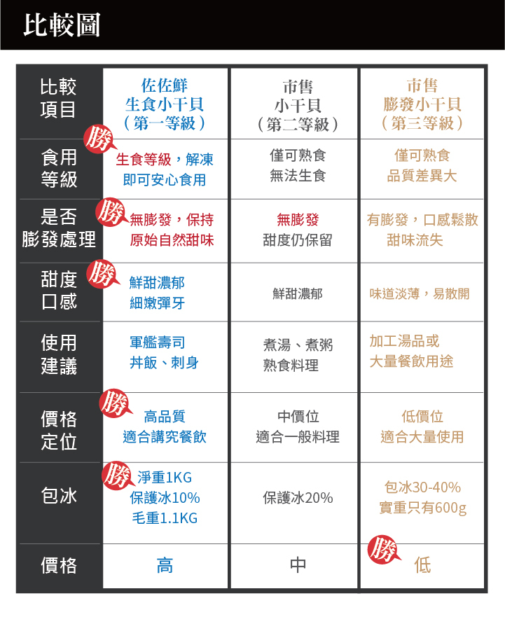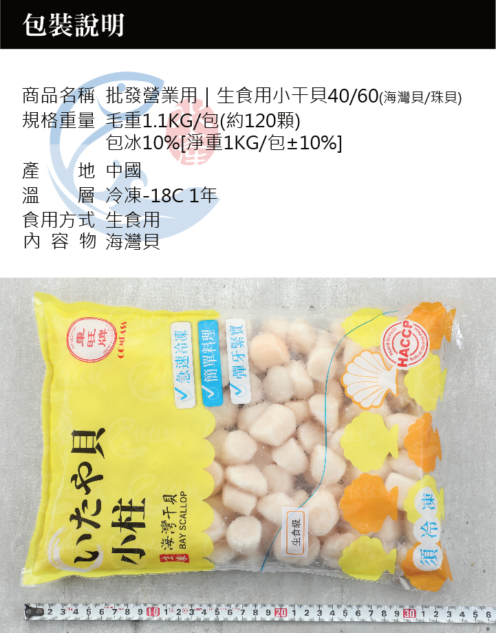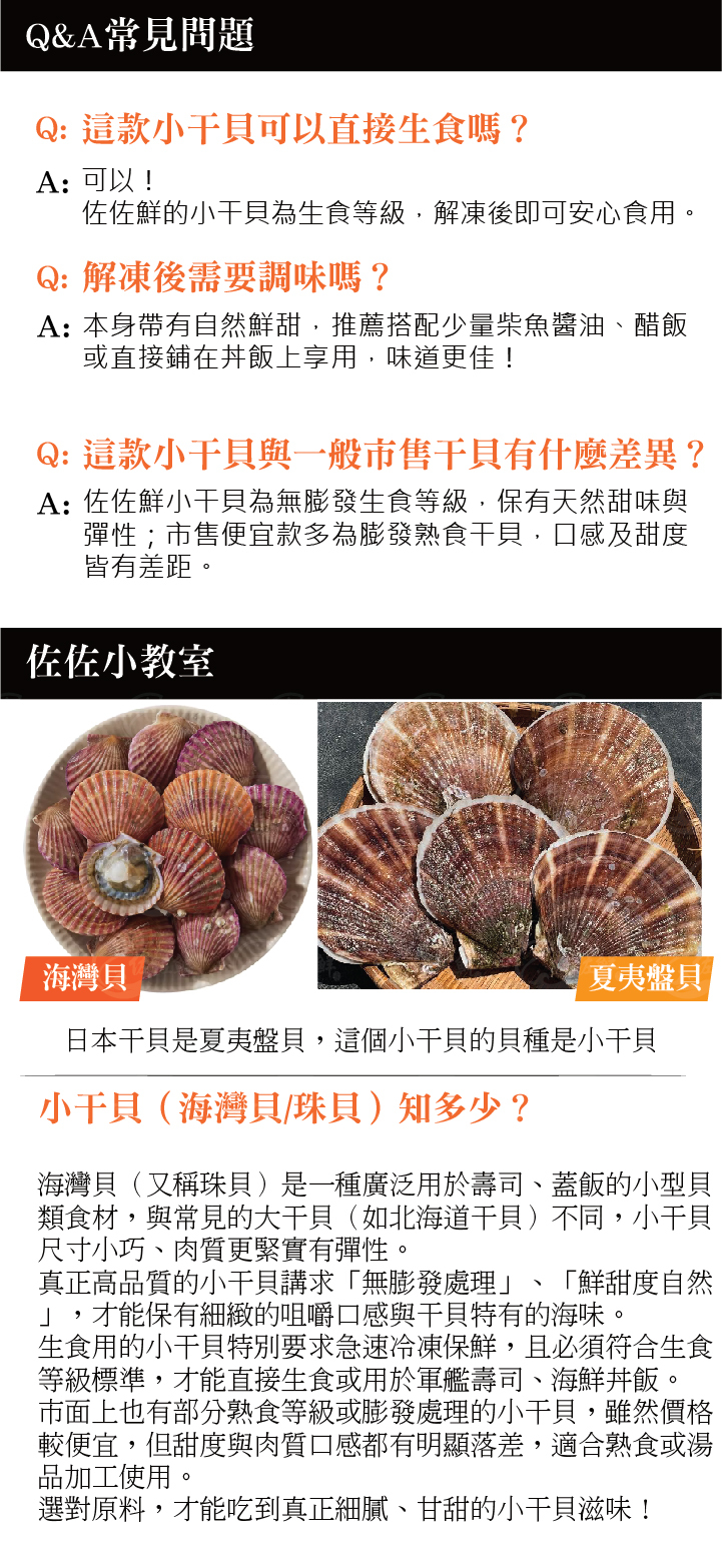 佐佐鮮嚴選生食等級小干貝(海灣貝/珠貝),規格為每磅約40~60粒大小,顆粒均勻飽滿,口感細緻鮮甜,解凍後即可直接生食,使用方便。因體型適中、肉質細嫩,廣受日本迴轉壽司店與連鎖餐飲愛用,特別適合軍艦壽司、海鮮丼飯、蓋飯點綴。只需搭配少量柴魚醬油輕醃,即能完美引出干貝的自然鮮味。全程急速冷凍保鮮,保留海味精華,讓專業料理與家庭簡餐皆能輕鬆展現高級水準。