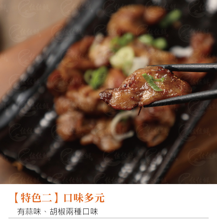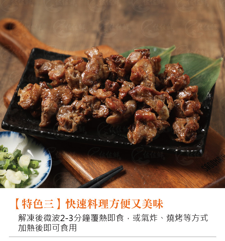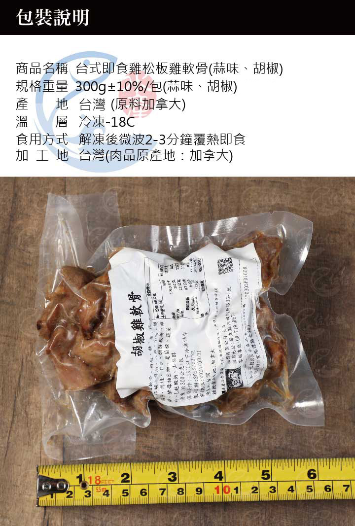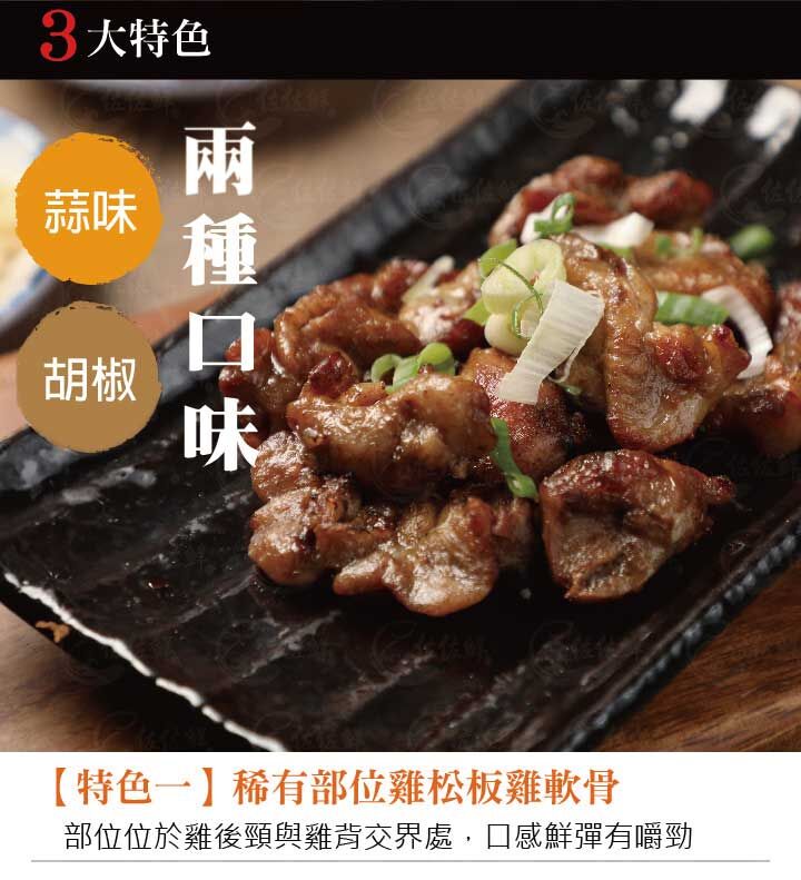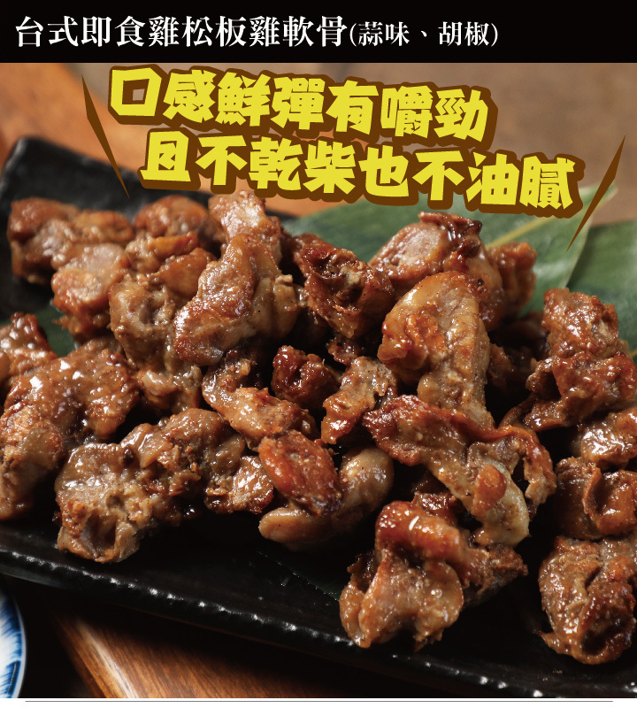 台式即食雞松板雞軟骨有蒜味、胡椒兩種口味,退冰微波覆熱或氣炸燒烤一下即可食用,部位位於雞後頸與雞背交界處,口感鮮彈有嚼勁,且不乾柴也不油膩