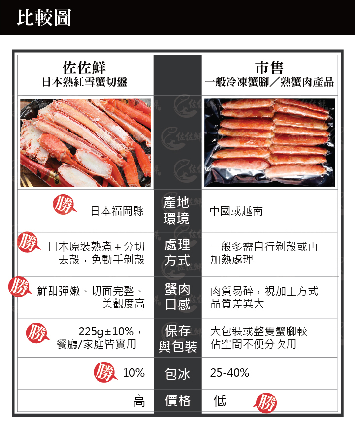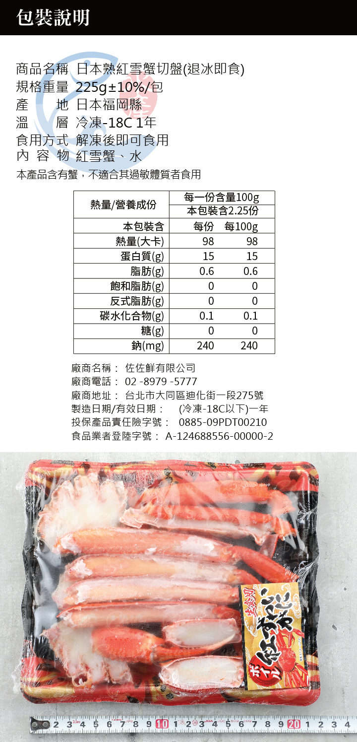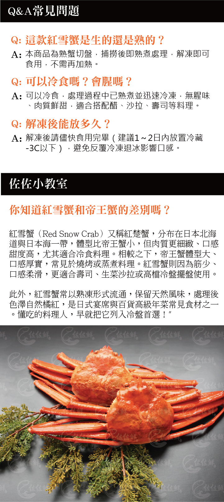 嚴選日本海域捕撈的紅雪蟹,捕撈後立即熟煮鎖鮮,保留蟹肉天然鮮甜與細緻口感。經精細分切去殼處理,每一塊蟹肉皆熟化處理完成,解凍即可食用,無需再加熱。蟹肉飽滿、質地彈嫩,呈現自然橘紅色,視覺與味覺兼具,無論冷盤、沙拉、火鍋、壽司或居酒屋料理皆宜。小包裝設計方便保存與分次使用,是高品質又實用的日式海鮮選擇。