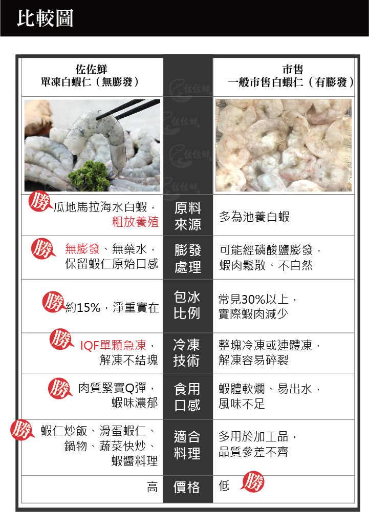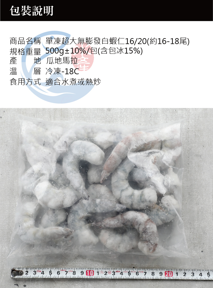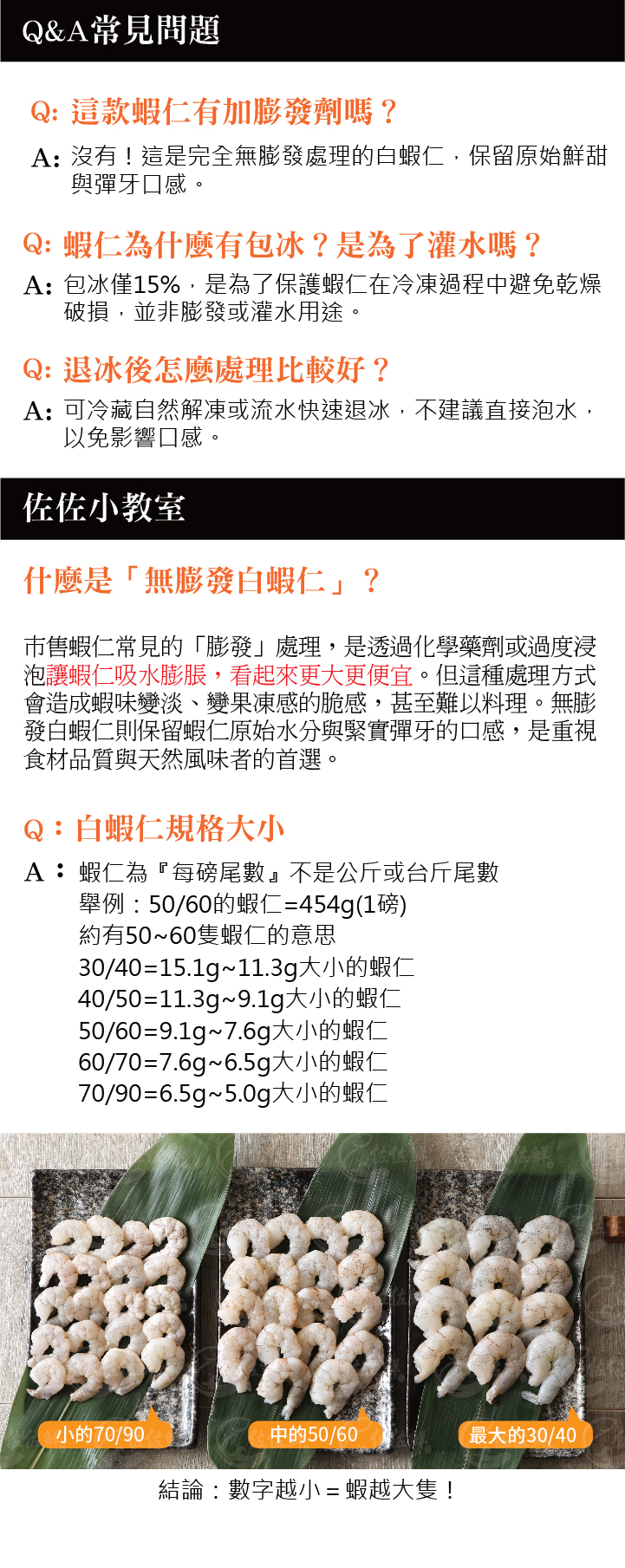 來自瓜地馬拉天然海域的超大白蝦仁,規格為16/20,每包約16~18隻,平均每尾重量達22~28g,是真正「吃一尾就滿足」的頂級規格。採用 IQF 單隻急凍技術(Individual Quick Frozen),蝦仁不會結成一團,方便取用與分裝。無藥物膨發處理,保留原始彈性與鮮甜口感。包冰率僅15%,解凍後蝦肉紮實不縮水,淨重實在,是餐廳、火鍋、鐵板、燒烤等料理的理想用料!