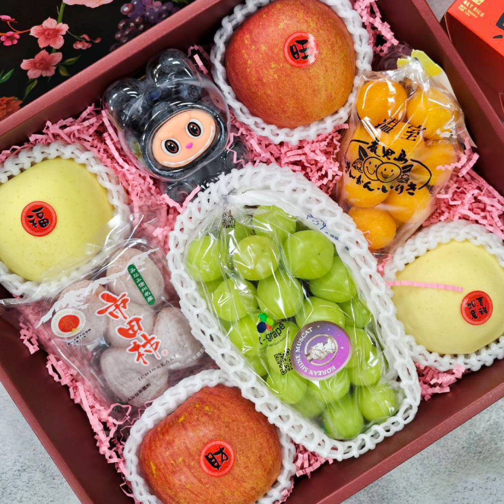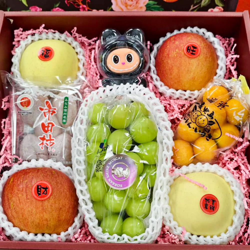 ( 蜜富士蘋果 2 顆 + 金星蘋果 2 顆 + 麝香葡萄 1 串 + 市田柿餅 1 包 + 金柑 1 袋 + 藍莓 1 瓶  )