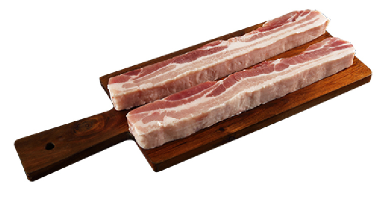 .取自腹脇部位,又稱為三層肉。油脂脆甜不膩口,帶皮含豐富膠質,適合滷、炒、川燙