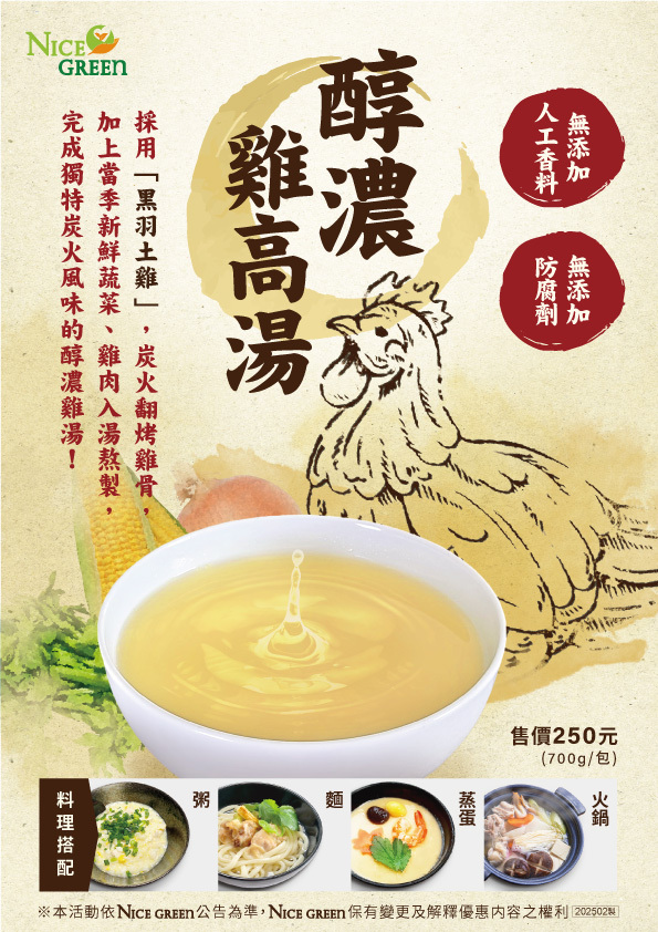 採用安心契作黑羽土雞,以炭火翻烤土雞骨,加上各種當季新鮮蔬菜、土雞肉入湯熬製,直至雞肉融入湯中,完成擁有獨特炭火風味又鮮甜的醇濃雞湯!