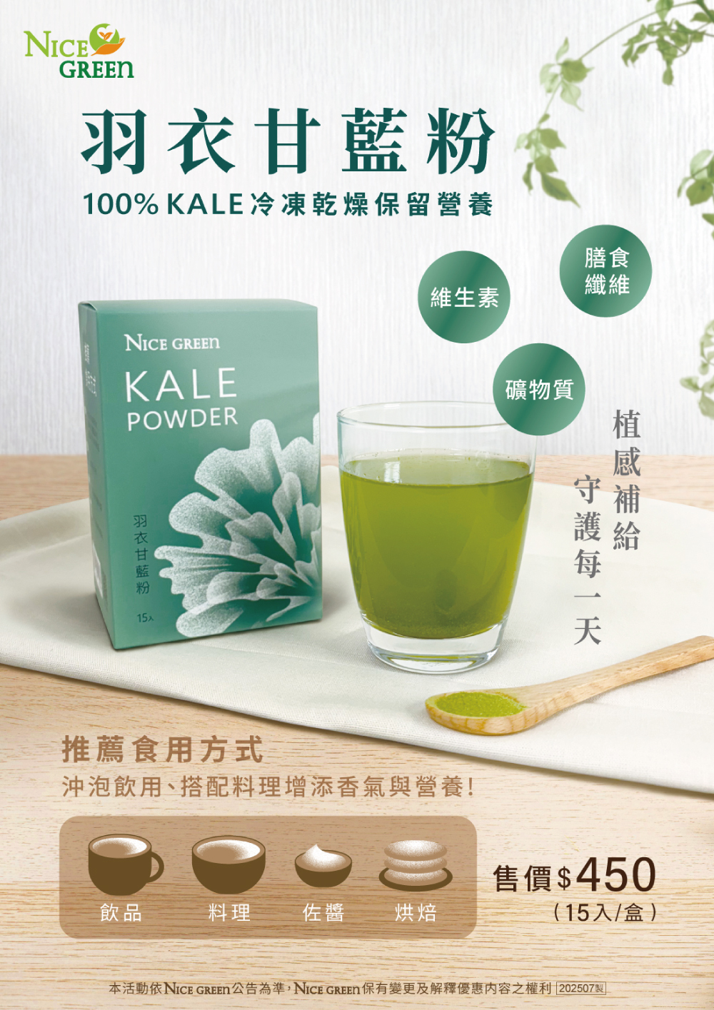 100%羽衣甘藍研磨成粉,冷凍乾燥技術保留營養,方便攜帶、為食物增添香氣與營養!