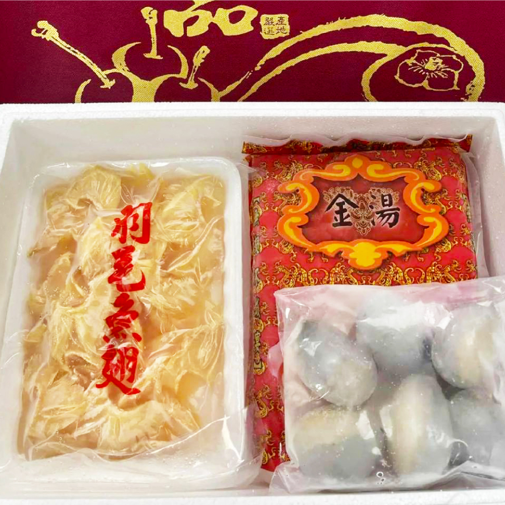 ( 羽毛翅 600g + 金湯 1500g + 另贈鮑魚 6 顆 )