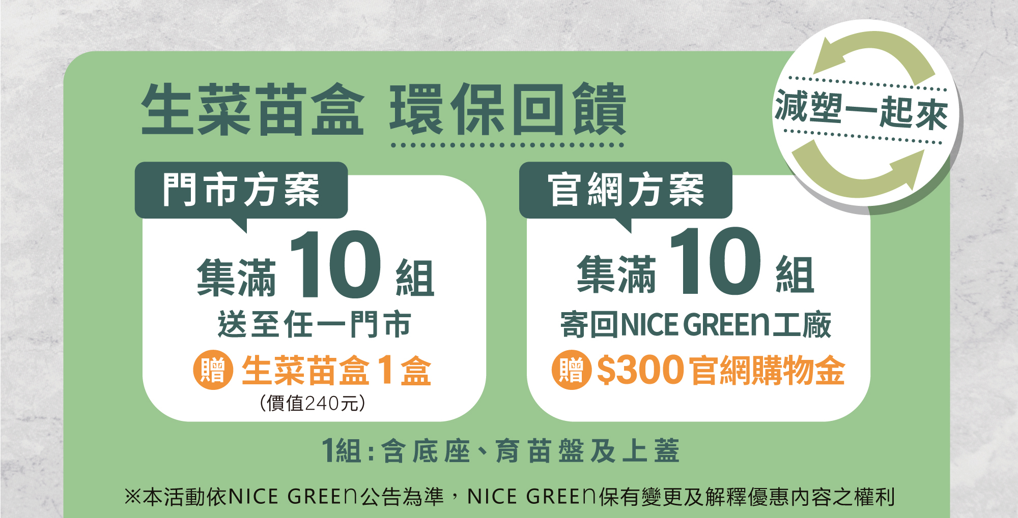 官網方案:集滿10組(含底座、育苗盤及上蓋)寄送回NICE GREEn工廠,即加贈300元官網購物金。