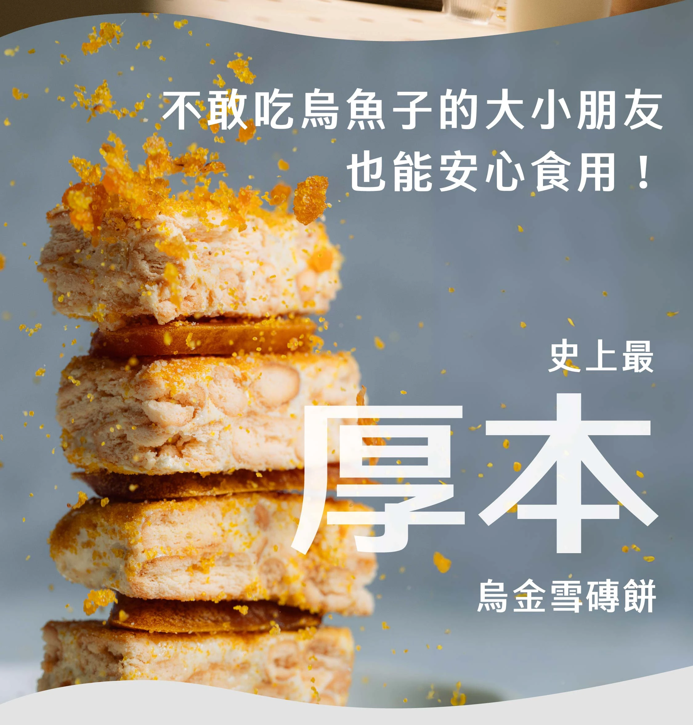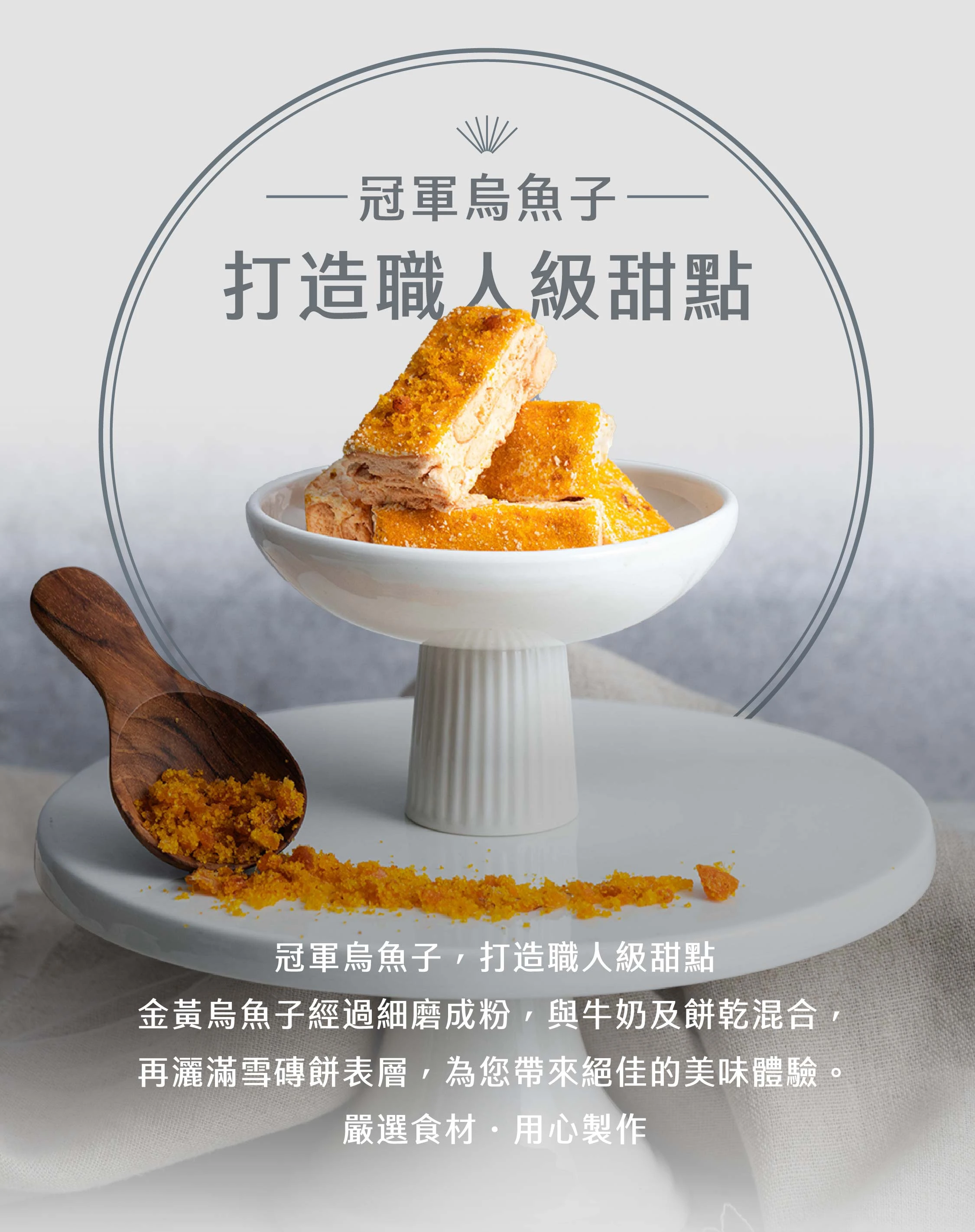 金黃烏魚子經過細磨成粉,與牛奶及餅乾混合,再灑滿雪磚餅表層,為您帶來絕佳的美味體驗。