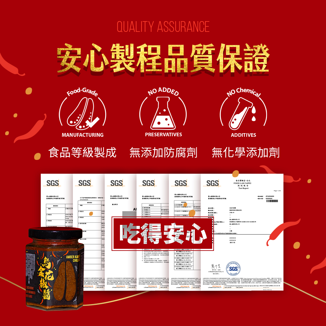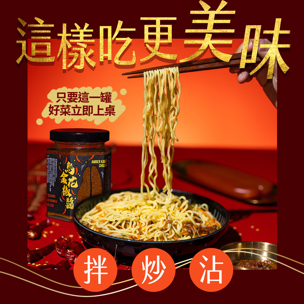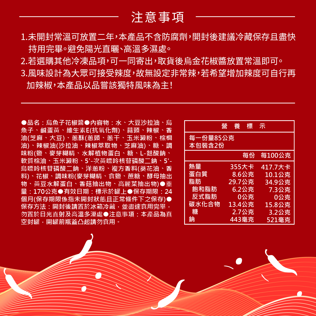 水、大豆沙拉油、烏魚子、鹹蛋黃、維生素E ( 抗氧化劑 ) 、蒜頭、辣椒、香油 ( 芝麻、大豆 )、蔥酥 ( 蔥頭、蔥干、玉米澱粉、棕櫚油 )、辣椒油 ( 沙拉油、辣椒萃取物、芝麻油 )、糖、調味粉 ( 鹽、麥芽糊精、水解植物蛋白、糖、L-麩酸鈉、軟質棕油、玉米澱粉、5’-次黃嘌呤核苷磷酸二鈉、5’-鳥嘌呤核苷磷酸二鈉、洋蔥粉、複方香料 ( 葵花油、香料 )、花椒、調味粉 ( 麥芽糊精、食鹽、蔗糖、酵母抽出物、黃豆水解蛋白、香菇抽出物、高麗菜抽出物 ))
