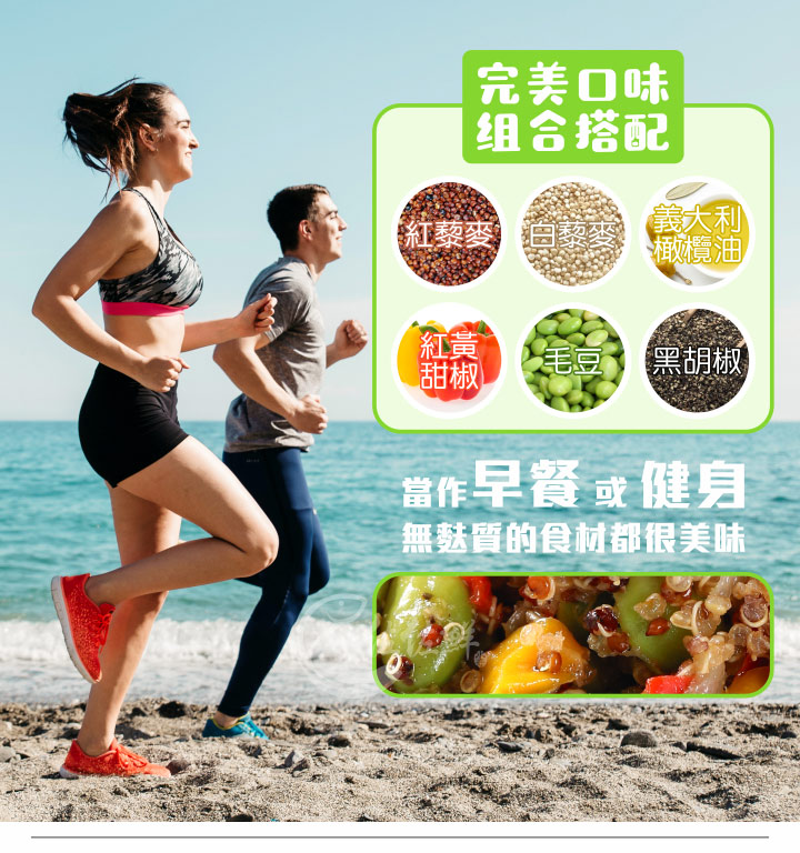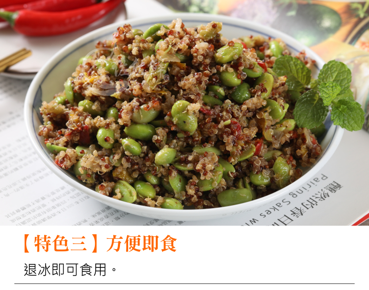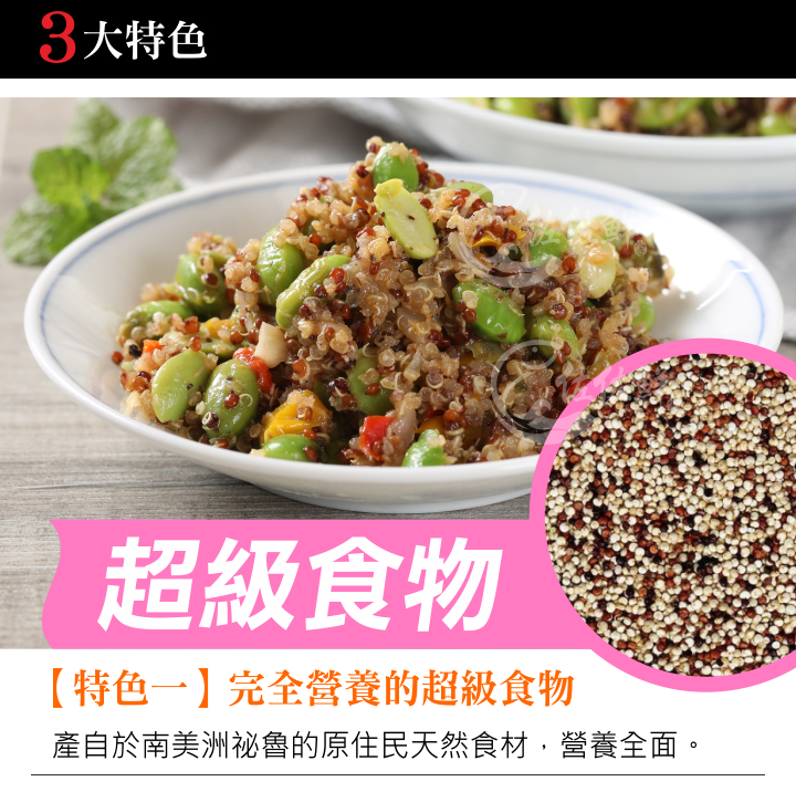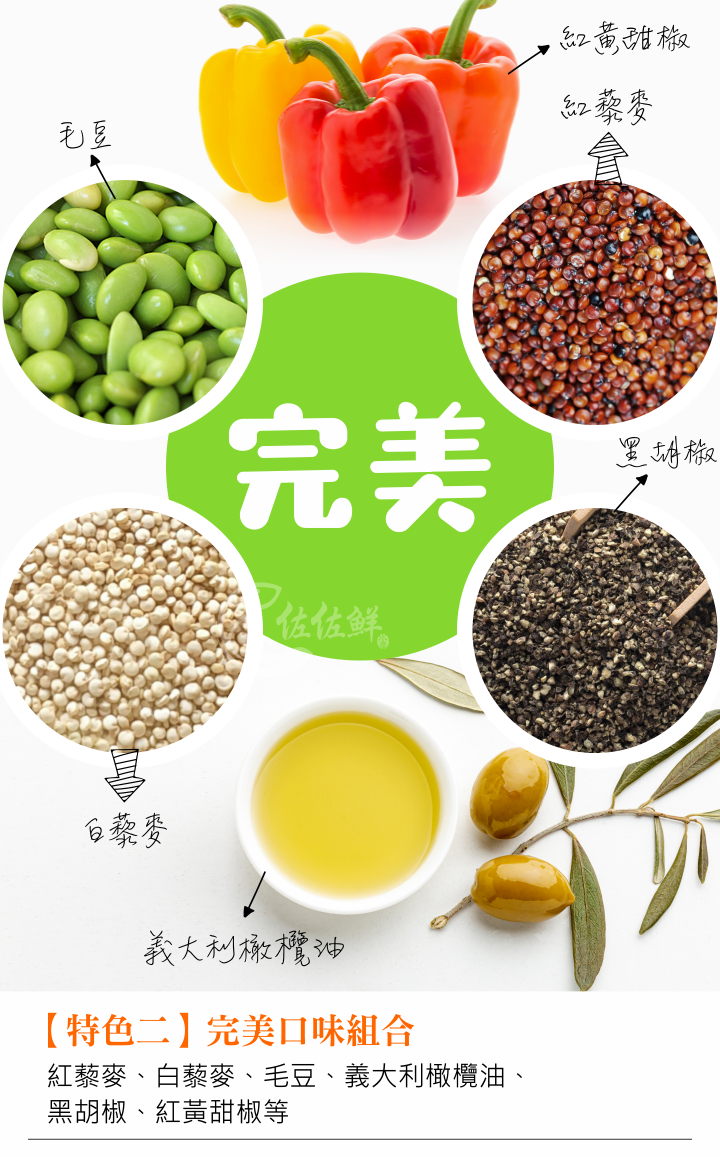 是個營養全面的超級食物,完美口味組合搭配紅藜麥、白藜麥、毛豆、義大利橄欖油、黑胡椒、