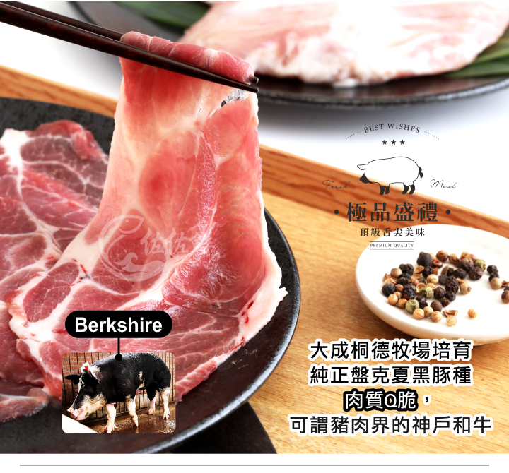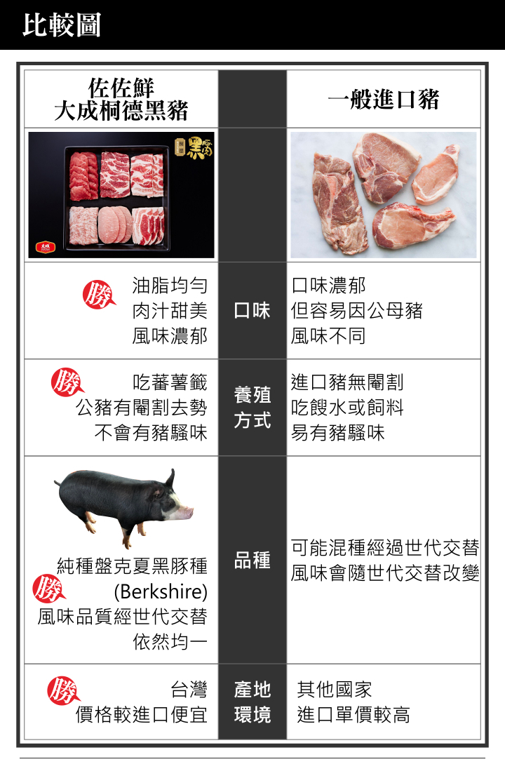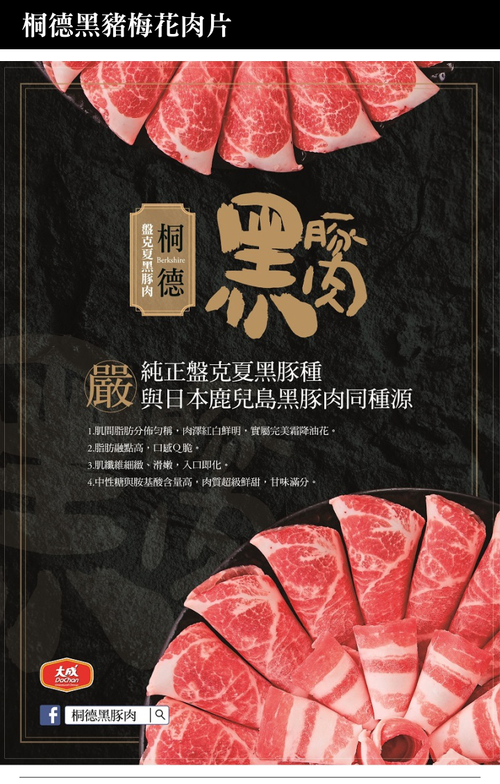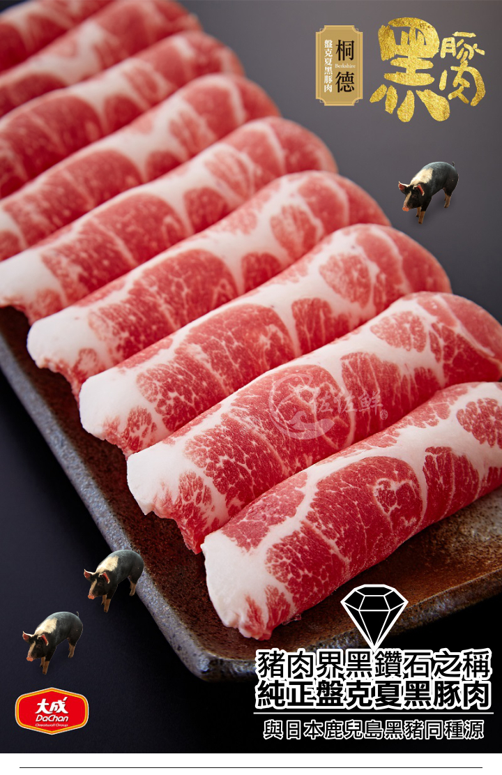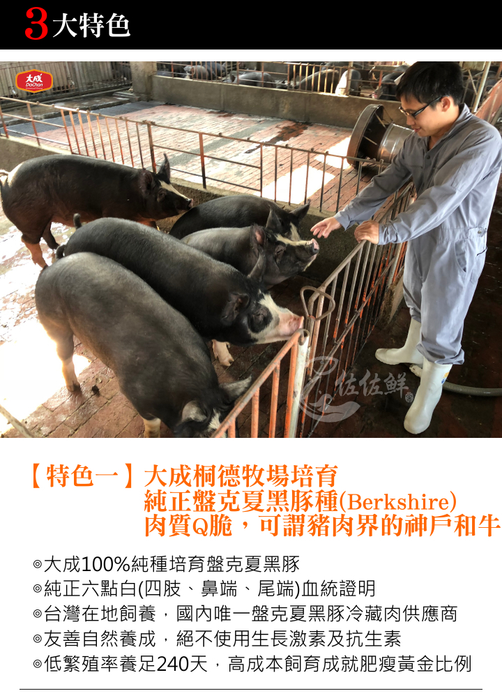 .大成桐德牧場培育純正盤克夏黑豚種(Berkshire)肉質Q脆,可謂豬肉界的神戶和牛