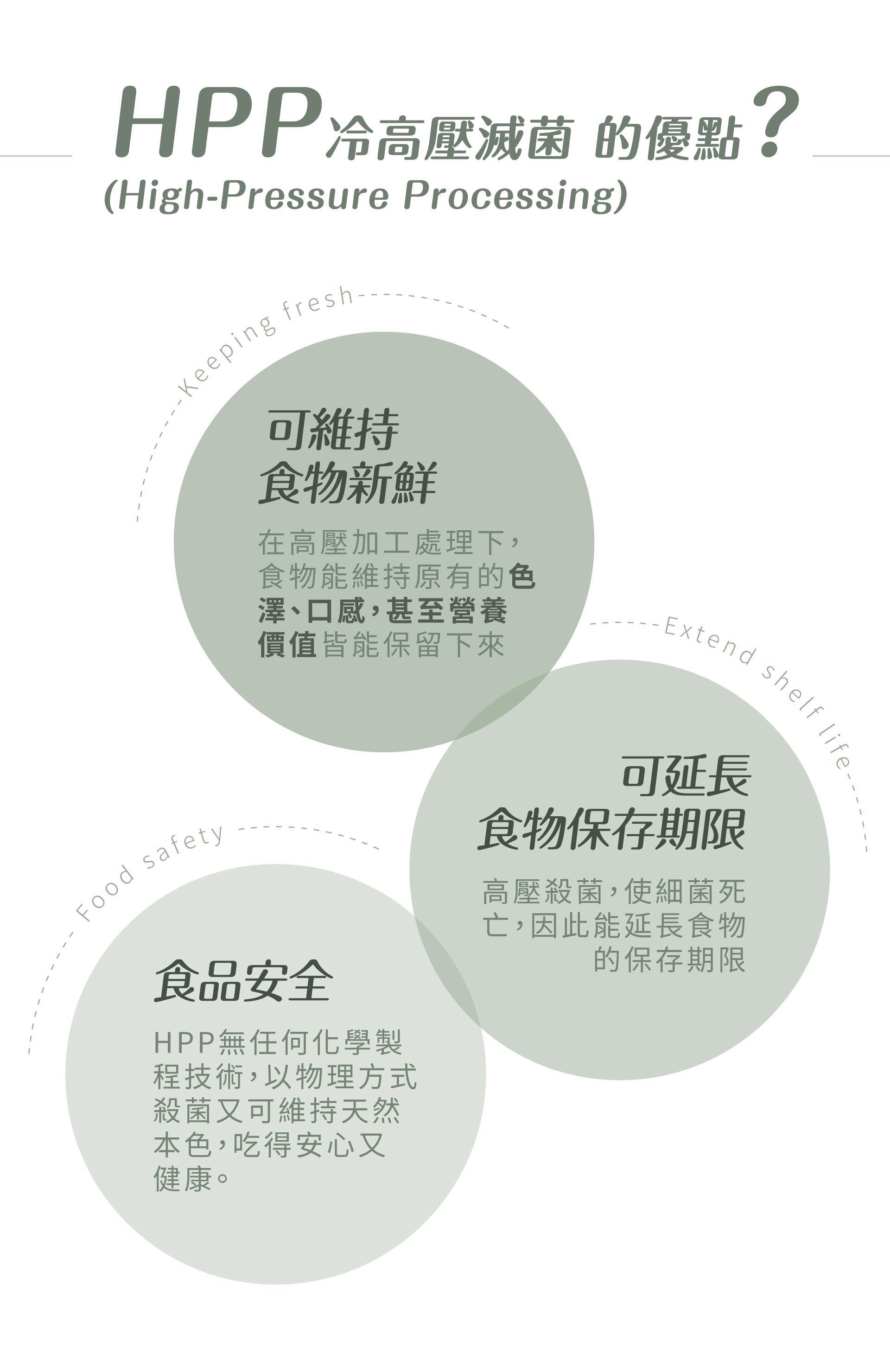 1)有別於傳統高溫殺菌的方式,在高壓加工處理下,食物能維持原有的色澤、口感,甚至營養價值皆能保留下來。