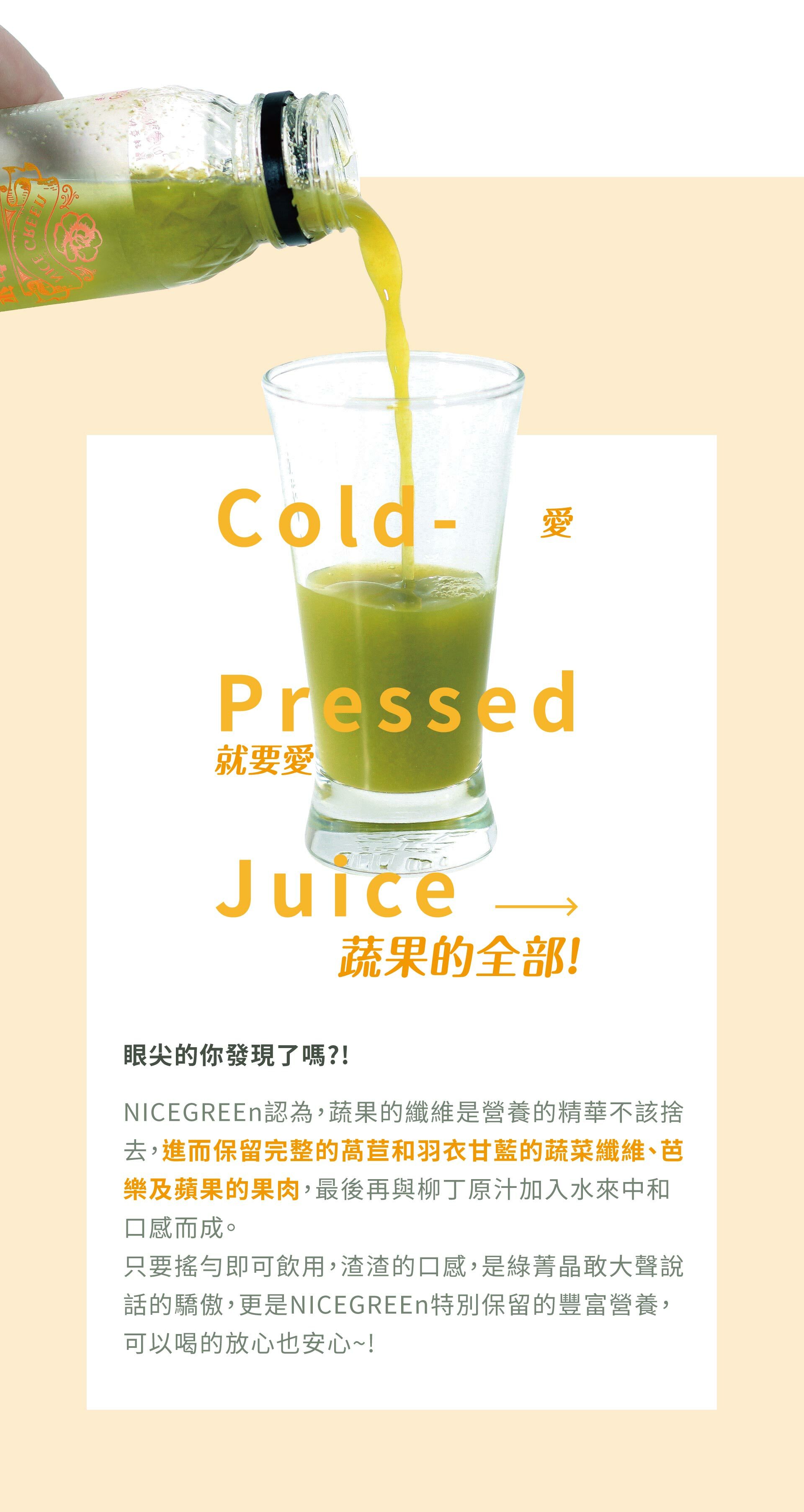 NICEGREEn認為,蔬果的纖維是營養的精華不該捨去,進而保留完整的萵苣和羽衣甘藍的蔬菜纖維、芭樂及蘋果的果肉,最後再與柳丁原汁加入水來中和口感而成。
