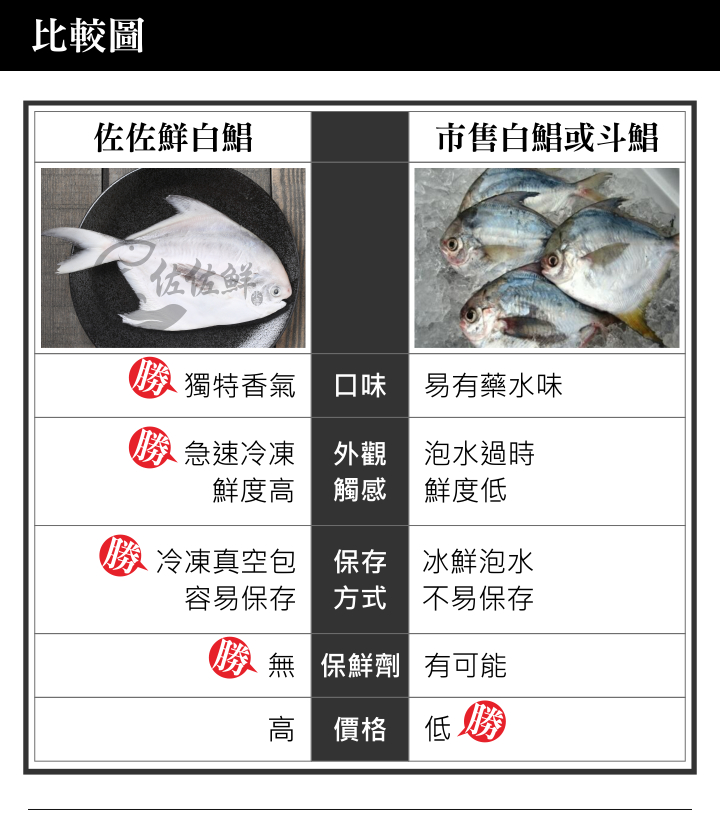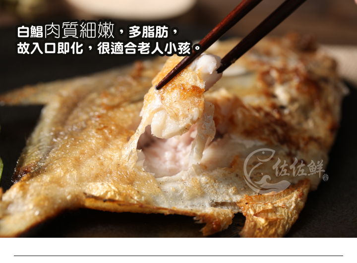 .佐佐鮮嚴選船撈急速冷凍的野生白鯧,魚刺少、擁有入口即化的細嫩肉質,老人小孩都適合!