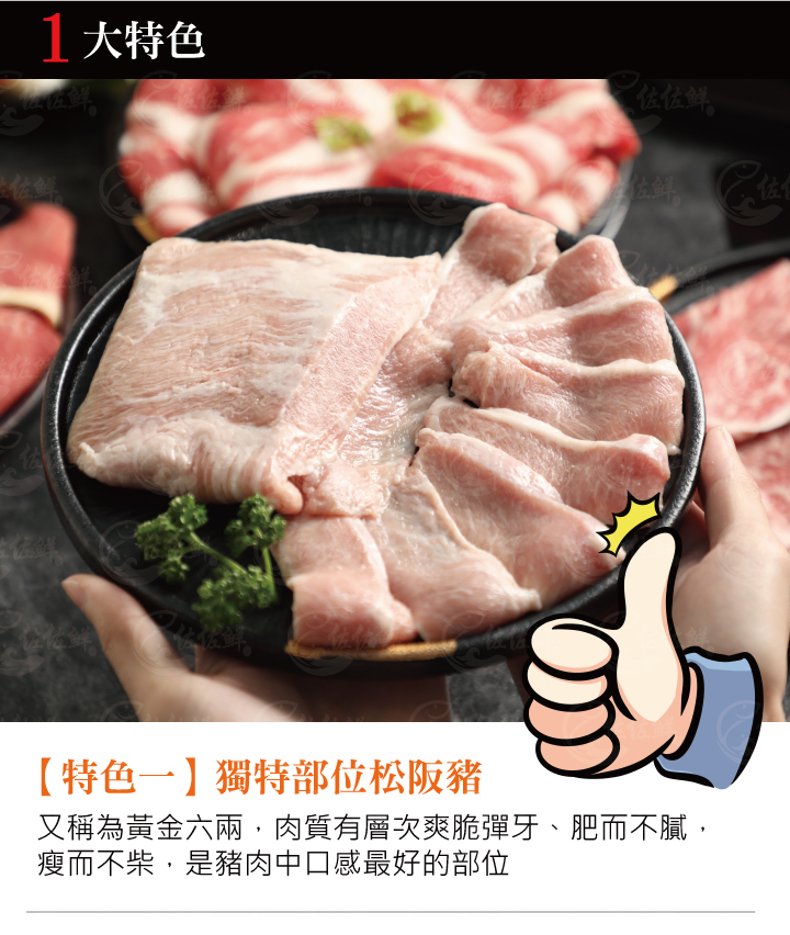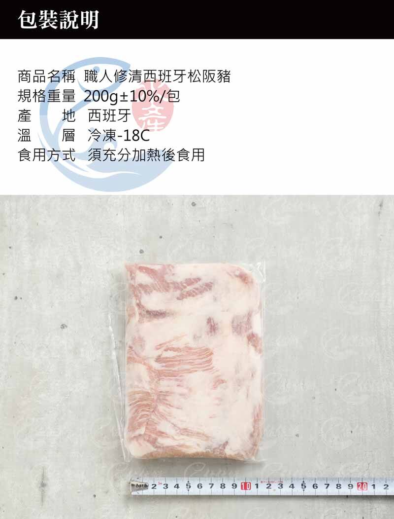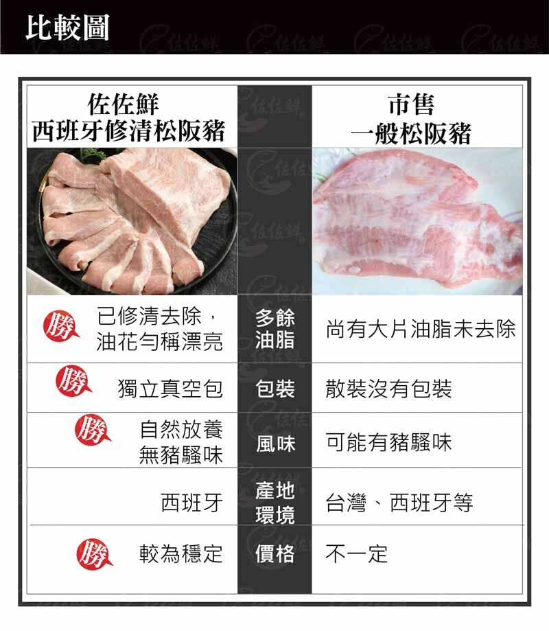 佐佐鮮西班牙修清松阪豬每頭豬僅能產出兩塊約莫200-300g的彌足珍貴的部位肉松阪豬肉,又稱為黃金六兩,肉質有層次爽脆彈牙、肥而不膩,瘦而不柴,是豬肉中口感最好的部位,松阪豬之所以珍貴,除了數量少,也是因被油脂包覆,必須小心修掉油脂才能露出,非常費工的方式才能產出